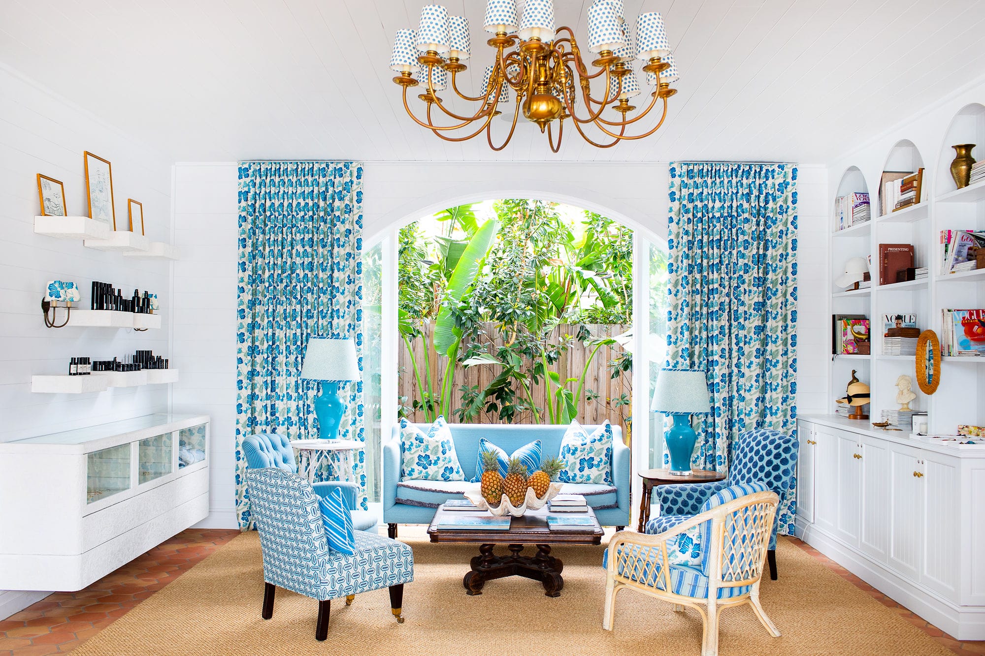 Harmonious print clashes and lashings of coral and baby blue are offset by nods to colonial plantation style – oak flooring, sturdy wooden antiques and wall panelling, botanical artworks, and walls lined with vintage magazines, including issues of the long-gone Collective Hub.
