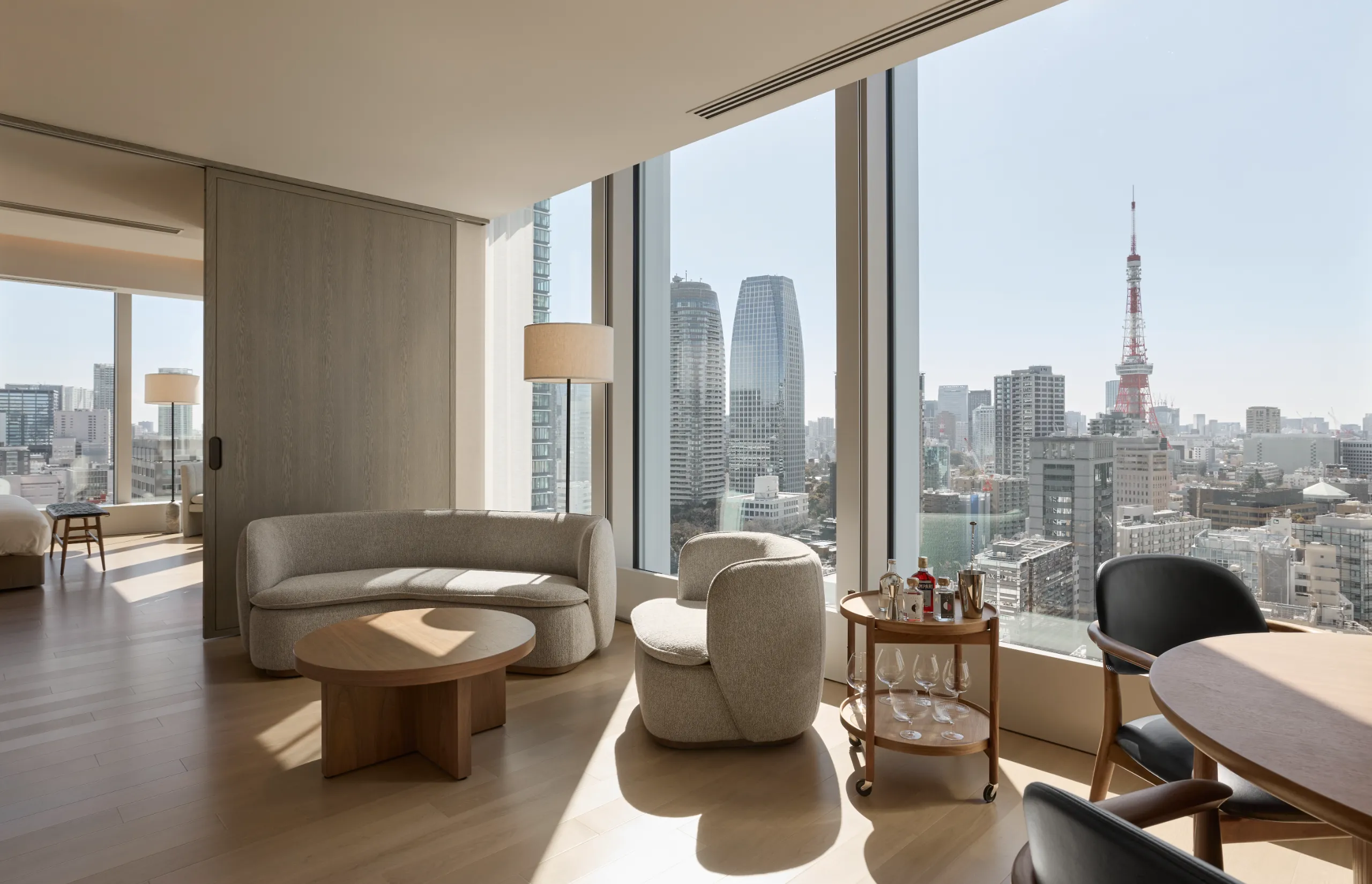 The room interiors make use of modular elements such as sliding doors, reminiscent of shoji screens in a ryokan, but also carefully curated design pieces which ensure that the spaces are as functional as they are luxurious.