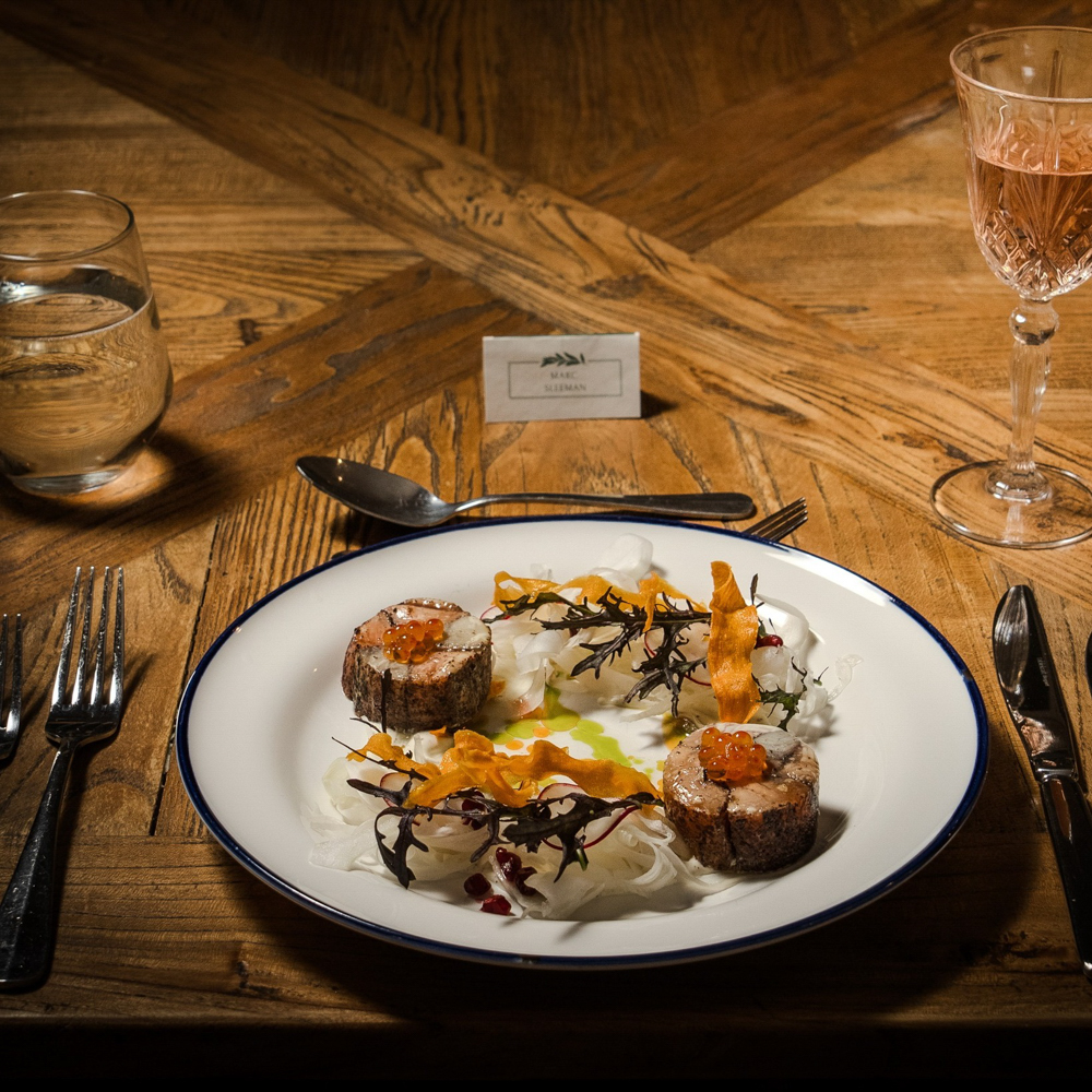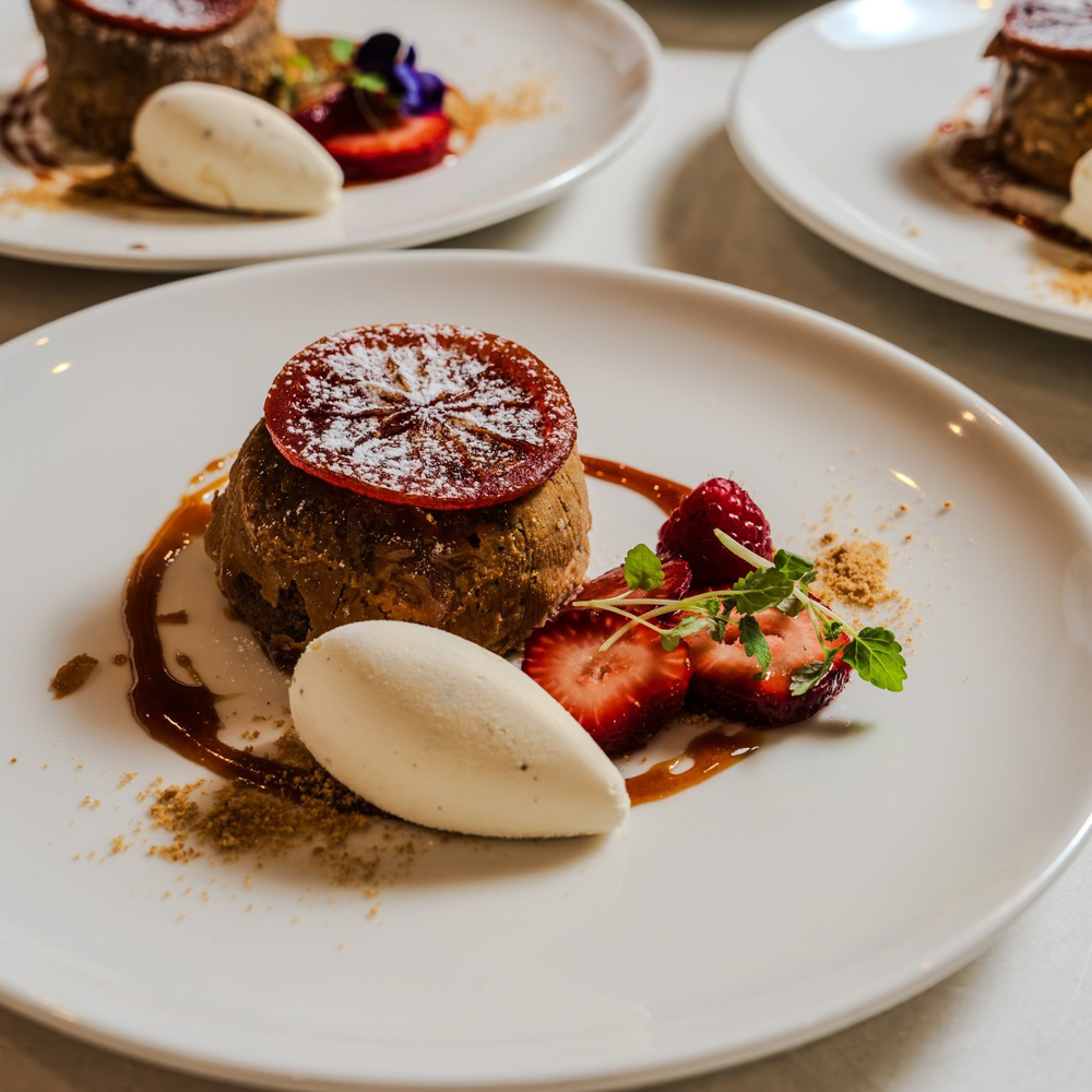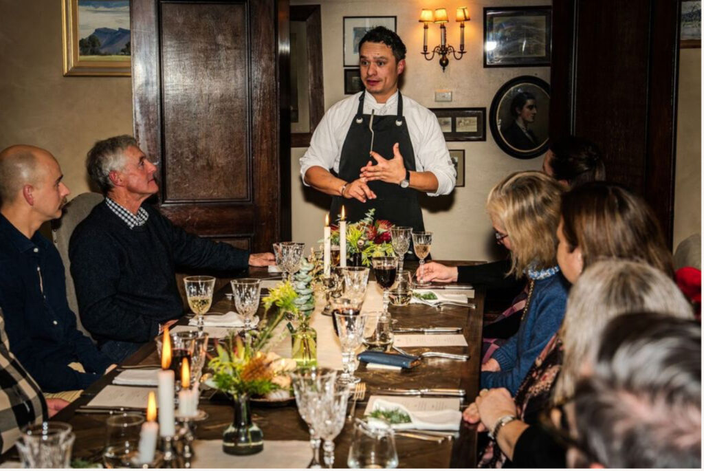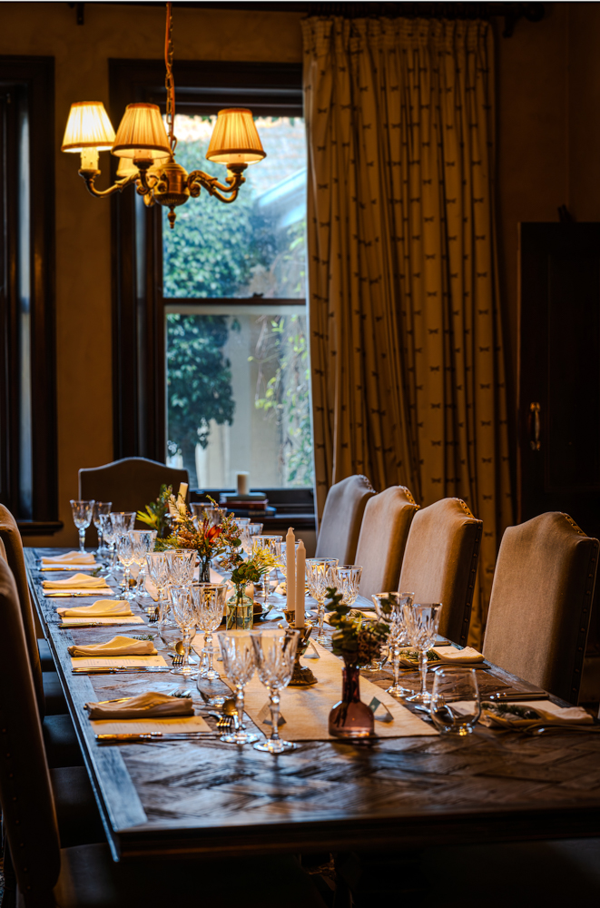 The night begins with pre-dinner drinks at 6 p.m., enjoyed fireside in the Rhino Room during cooler months or out on the verandah in summer, with sweeping views of the gardens and surrounding mountains. Guests then gather at a beautifully set communal table in the Homestead’s dining room, where crystal glassware and vintage accents evoke the property’s storied past. It is here that Executive Chef Dean Sibthorp introduces the three-course seasonal menu, created from produce grown on-site and sourced from neighbouring farms. The set menu changes regularly, ensuring each evening feels unique and deeply tied to the rhythms of the land.