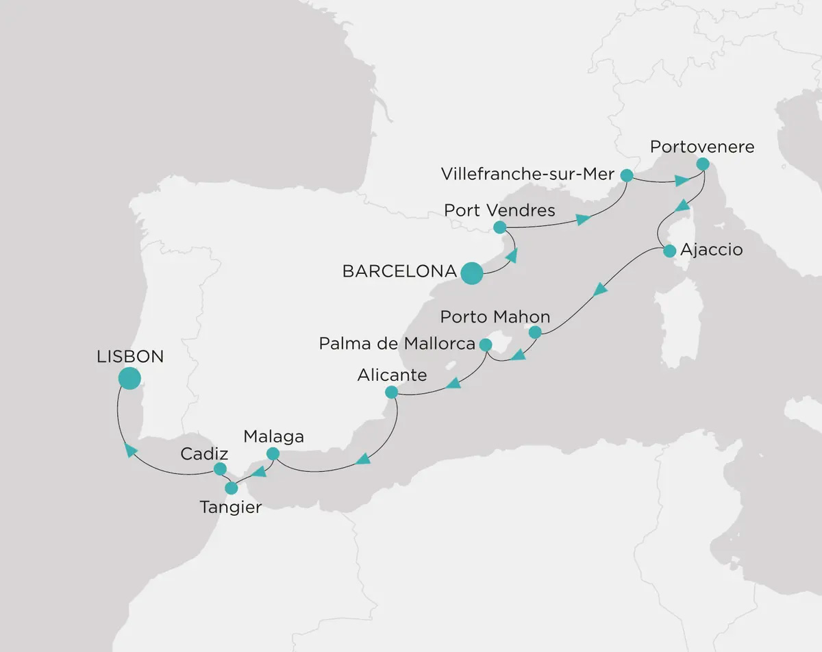 Cruise from vibrant Barcelona to Lisbon, visiting enchanting Mediterranean ports like Villefranche, Cinque Terre, Ajaccio, Menorca, Palma, Málaga, Tangier and Cadiz. Discover rich history, vibrant culture, and breathtaking coastal beauty, savouring world-class dining in all-inclusive luxury on an unforgettable voyage.